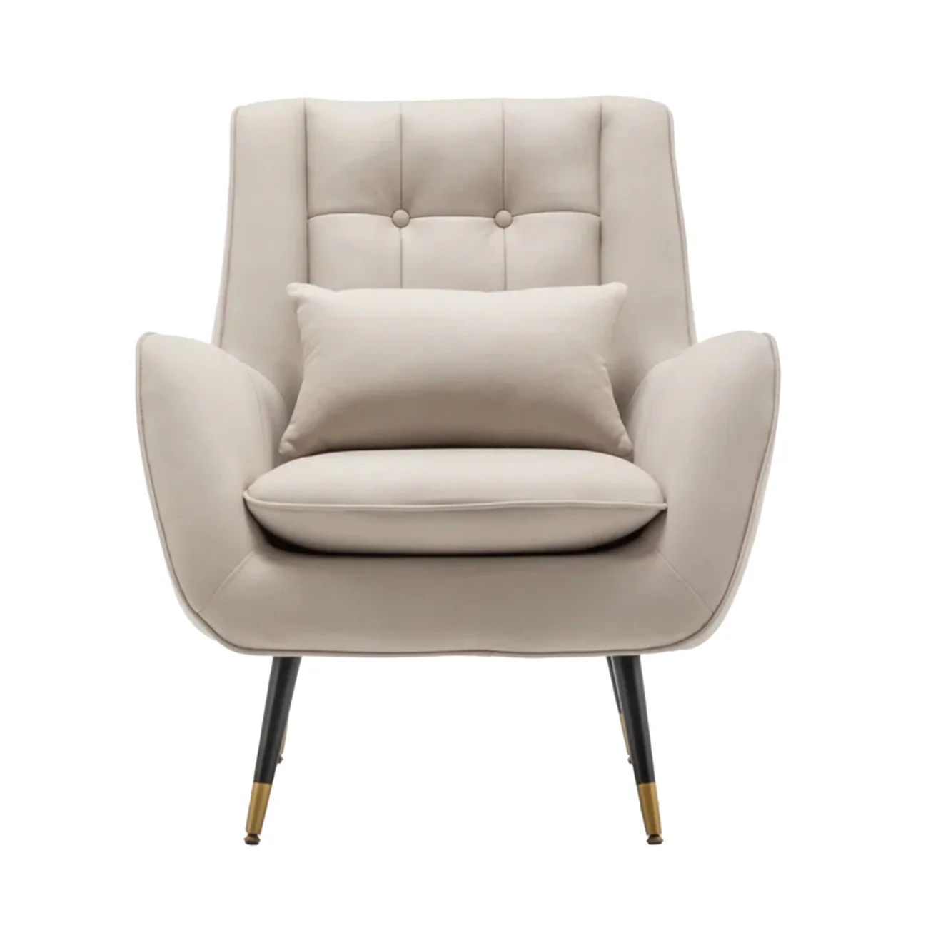 The elegant Plush Velvet Accent Chair in Beige will add elegance to your living room. This chair’s sleek form and luxuriously soft velvet fabric give a touch of elegance and relaxation to any environment. The tufted backrest and luxurious upholstery are matched with a matching lumbar cushion, which offers both elegance and practical support. The chair is supported by sleek black legs with gold-tipped embellishments, which offer modern flare while also assuring longevity. This chair is ideal as a statement piece in your living room, bedroom, or reading corner, combining usefulness with timeless style.