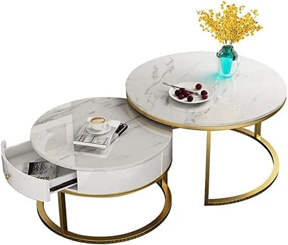- This unique round coffee table set features one large table with a glass top and a smaller table with an artificial marble top and is a must-have accent piece for your home. Use it to add a touch of contemporary flair to a traditional space or to simply complete a modern aesthetic.